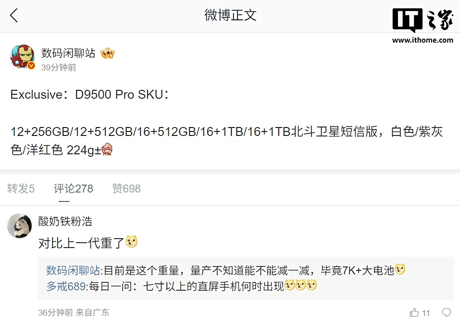 IT之家 8 月 26 日消息,博主 @数码闲聊站 今日爆料了一款天玑 9500 新 Pro 机型的可选版本: