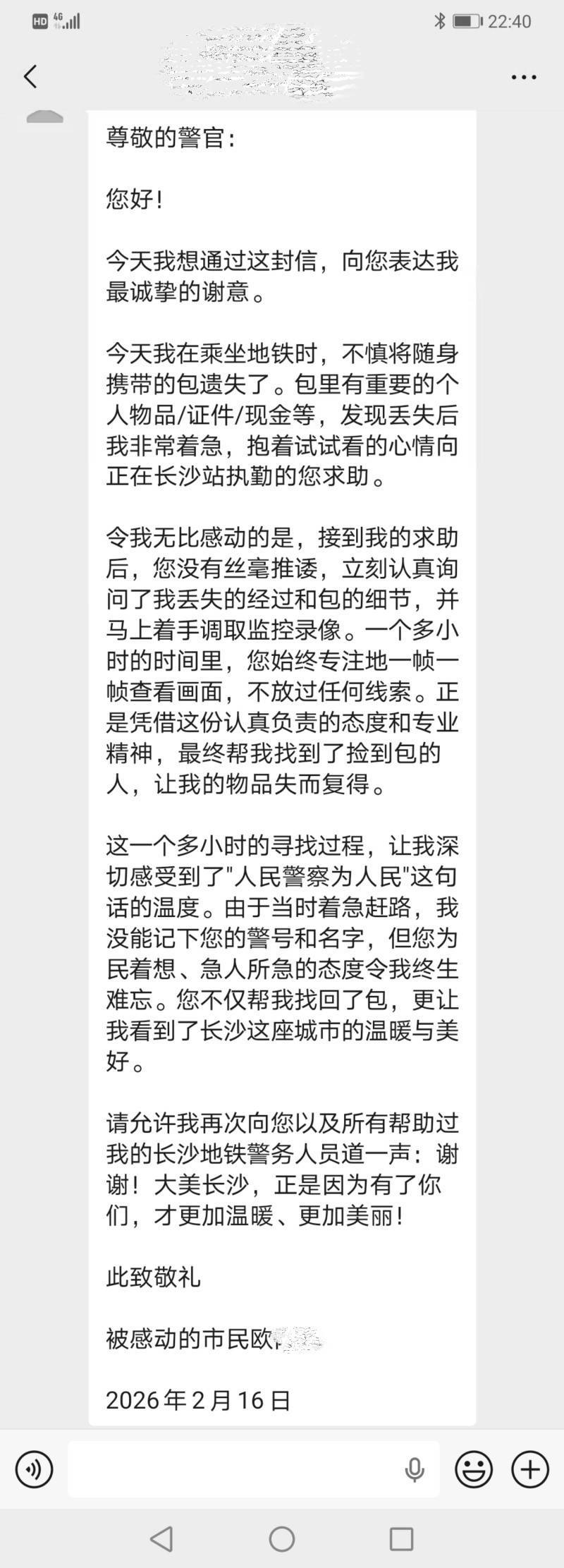 循着现有线索,民辅警多方核实打听,辗转联系上捡包人的儿子。经过耐心沟通,捡包人答应次日将手提包归还至长沙火车站地铁站警务室。