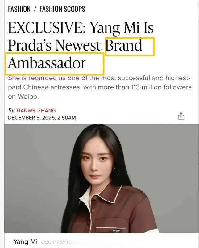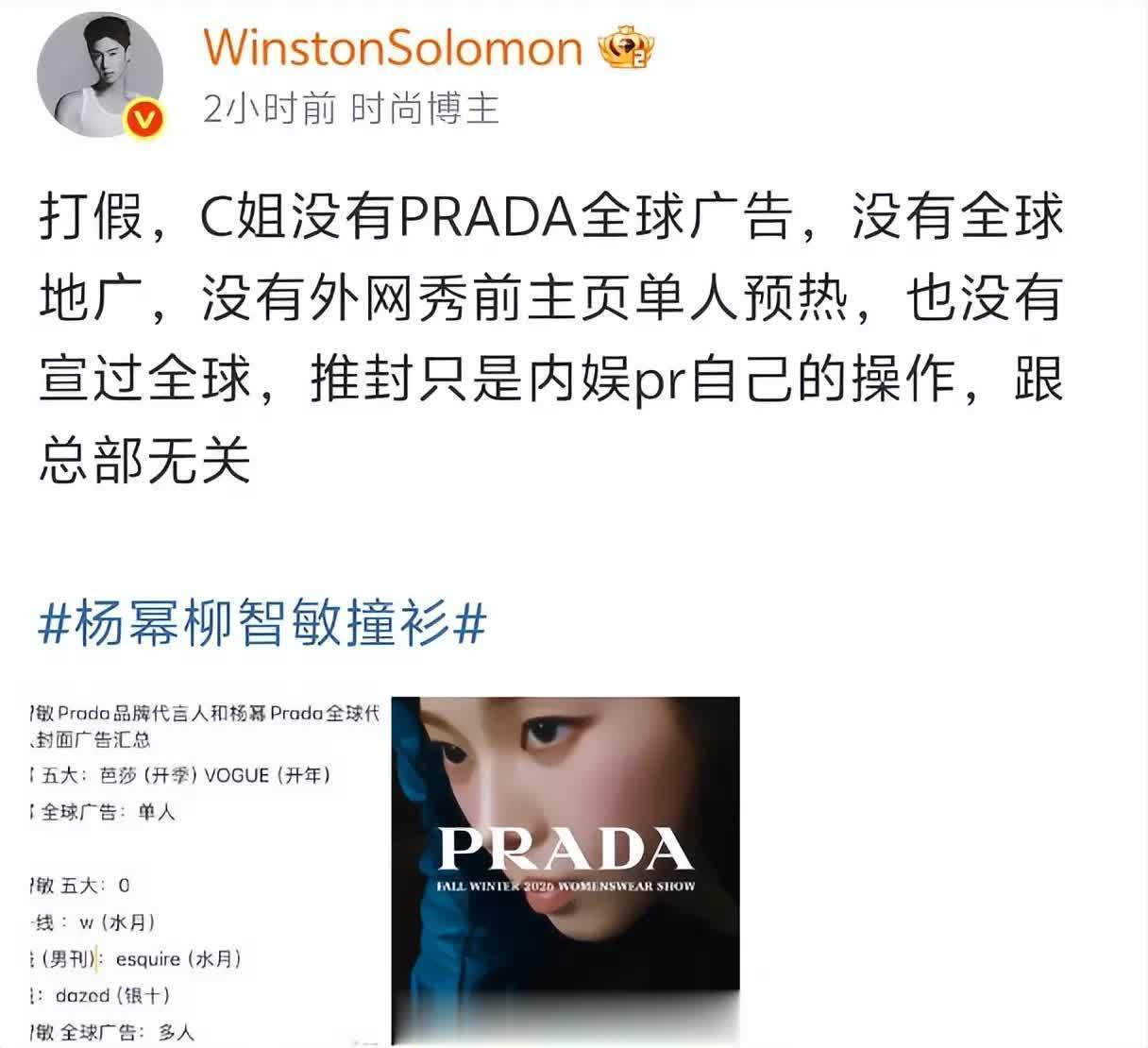 表面上看,杨幂在Prada的待遇不错,开年一系列重要活动都身着Prada,还有品牌推封。然而,一位时尚博主却指出,她仍有内娱特供的意味,与其他代言人相比,待遇实则不佳。时尚博主指出杨幂在Prada的待遇存疑。