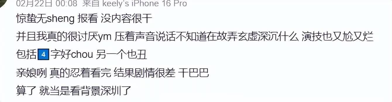 杨幂作为从古偶剧爆火出圈的小花,演技一直保留着夸张瞪眼的风格,虽在《生万物》中有所收敛,但新剧若回归《哈尔滨1944》时的状态,难免贻笑大方。杨幂演技风格遭质疑。