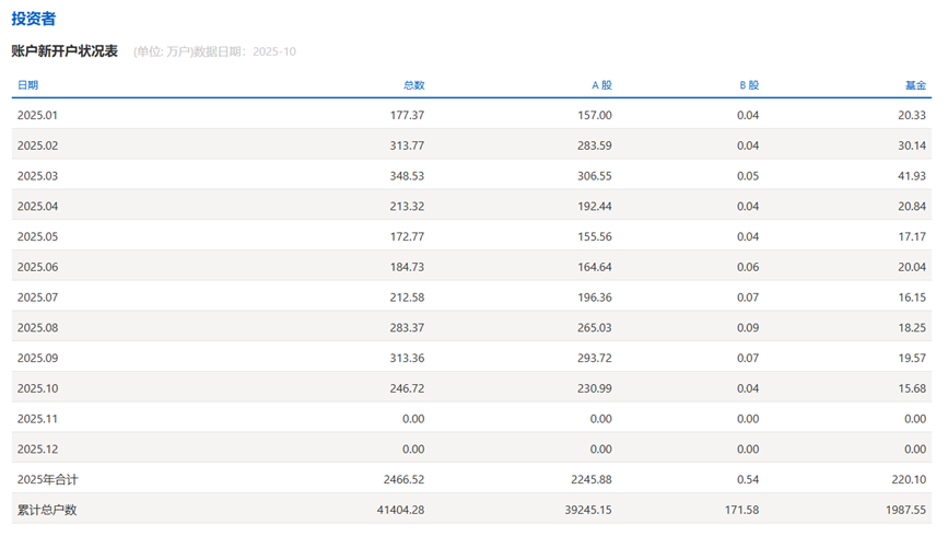 回望过去10个月,股民新开户数呈现波动上升的趋势。数据显示,2025年1月至9月,A股新开户总数分别为157万户、283.59万户、306.55万户、192.44万户、155.56万户、164.64万户、196.36万户、265.03万户、293.72万户。