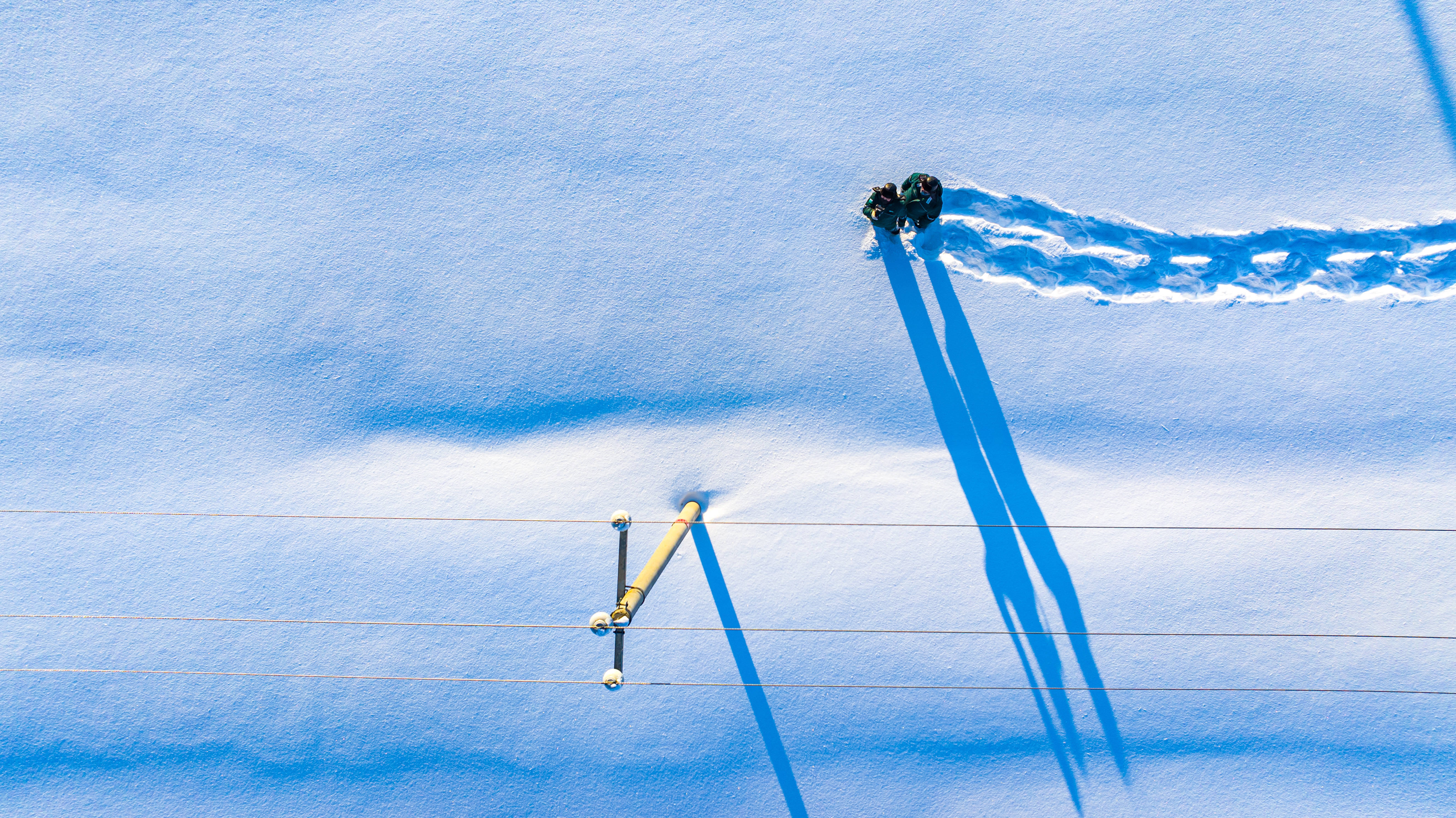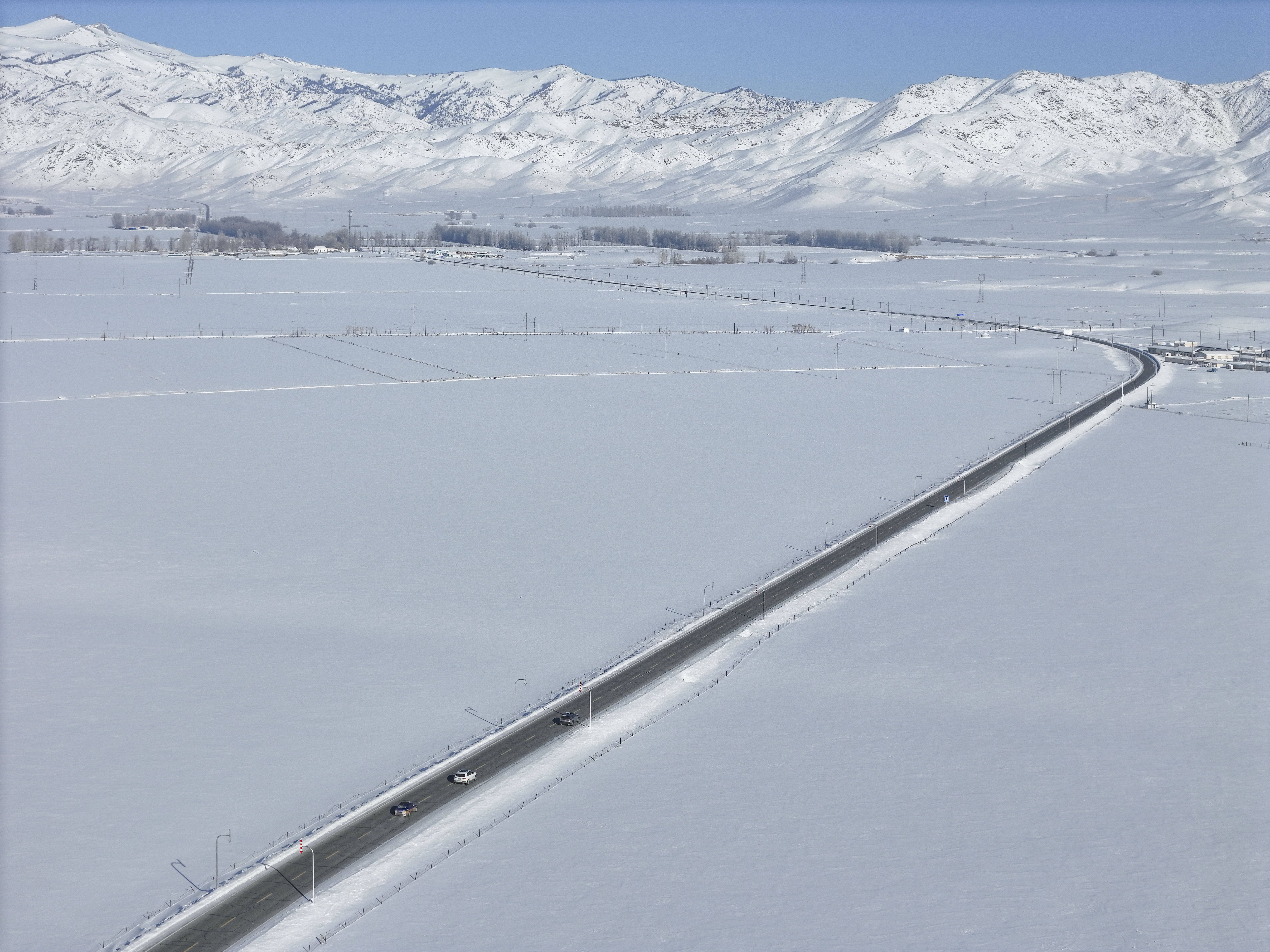 1月16日,吐尔洪乡供电所员工在巡检路上(无人机照片)。新华社发(努尔别克·努尔曼 摄)屋外呵气成霜