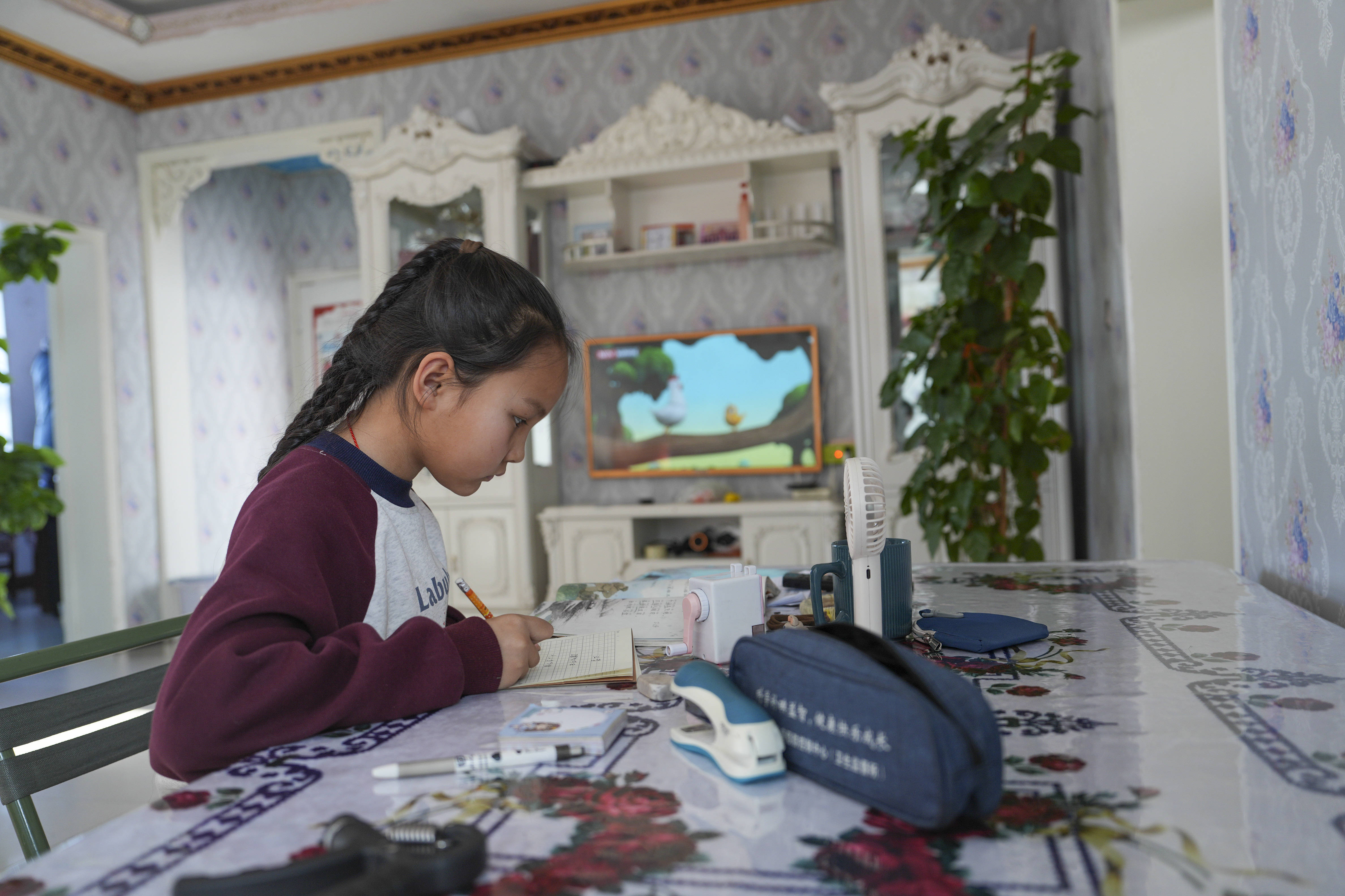 1月16日,在吐尔洪乡康阔勒特克村,小学生哈拉哈提·朱马别克在家中抄写古诗。新华社记者 胡虎虎 摄