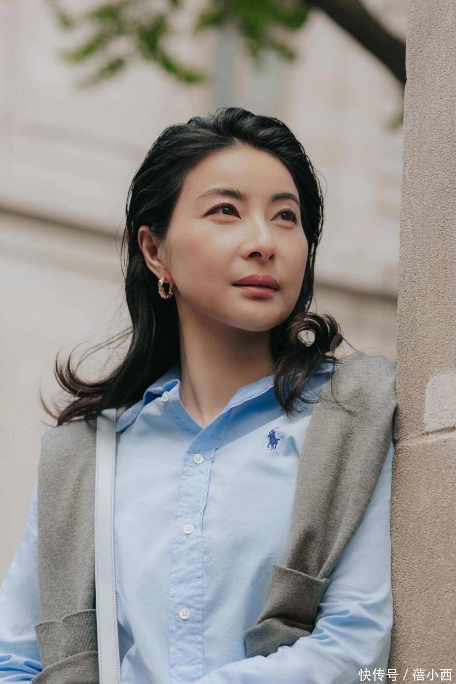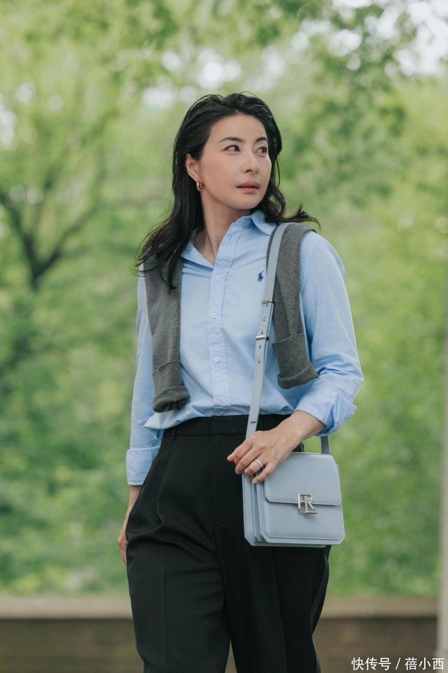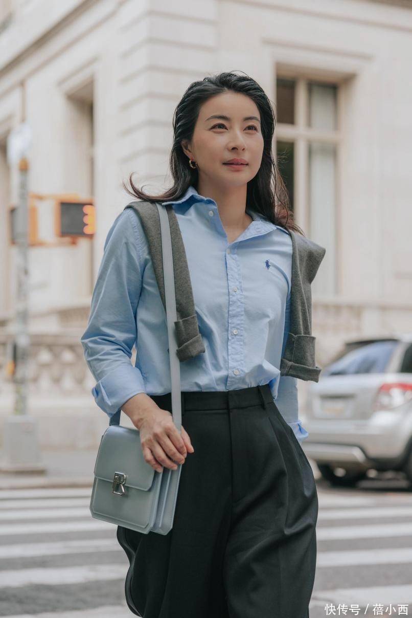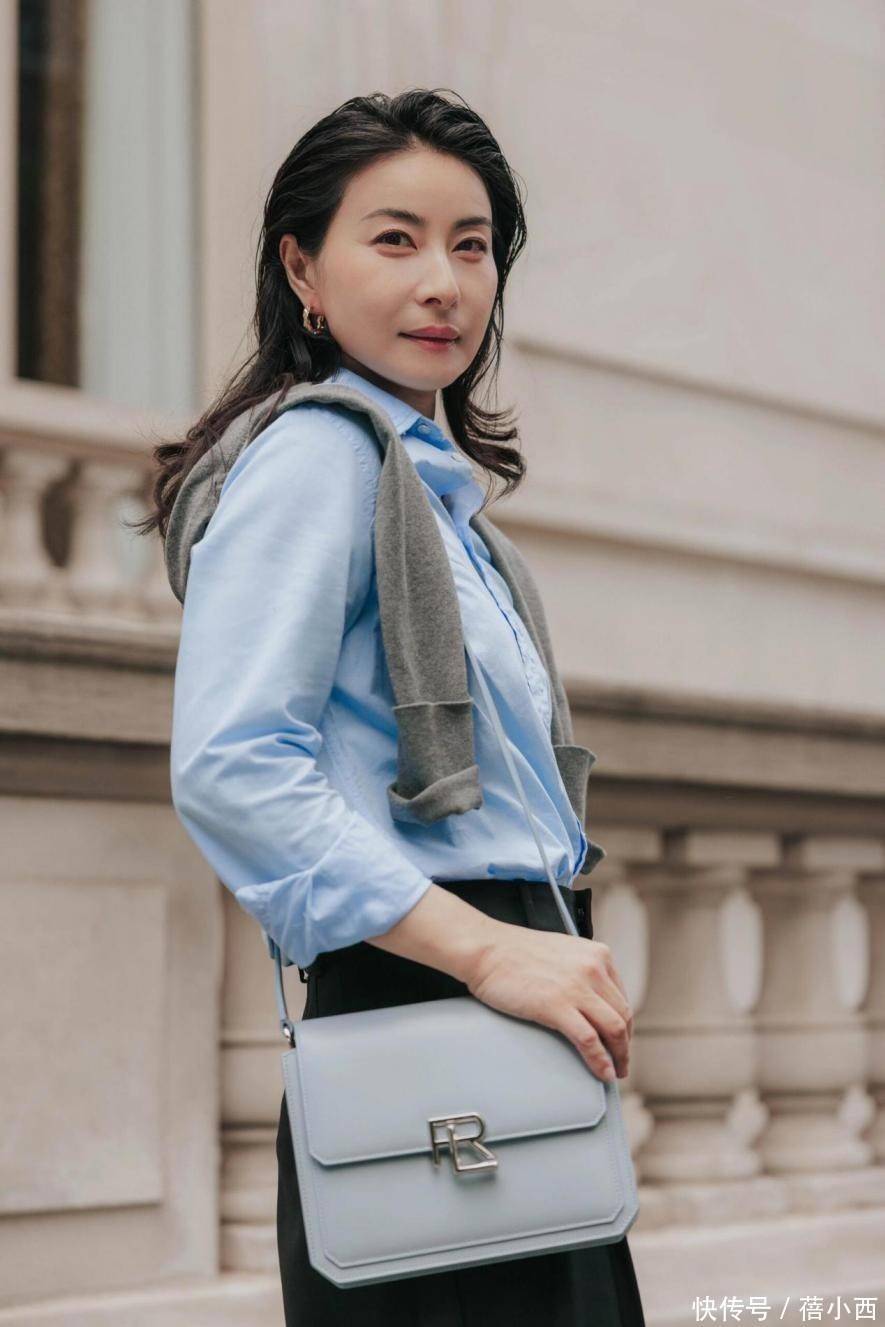 头发是自然黑,对女生的肌肤颜色一点都不挑。头发长度刚过肩膀,发尾带着一点随性的弧度,看不到刻意打理的痕迹。上身穿了一件长袖衬衫,所采用的棉质面料挺有质感,浅蓝色给人很干净的感觉,不是那种扎眼的亮蓝。翻领设计基本不能少,其可谓是衬衫的灵魂。紧挨着锁骨的扣子解开了,从第二颗开始就被扣上了,视觉上衬得人很利落。
