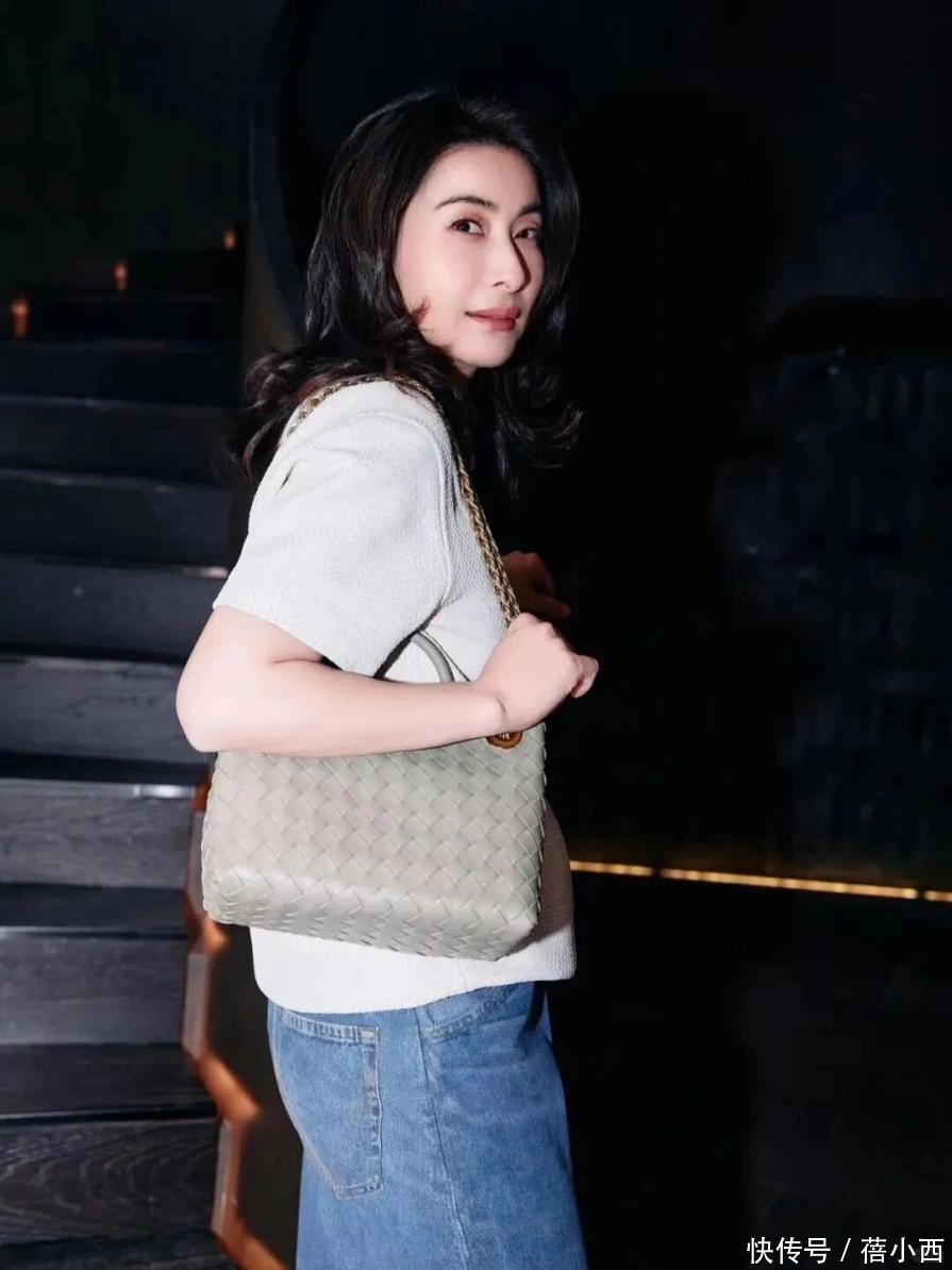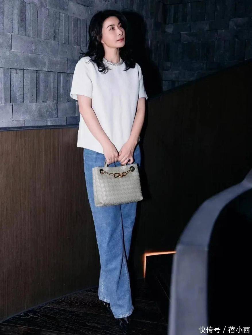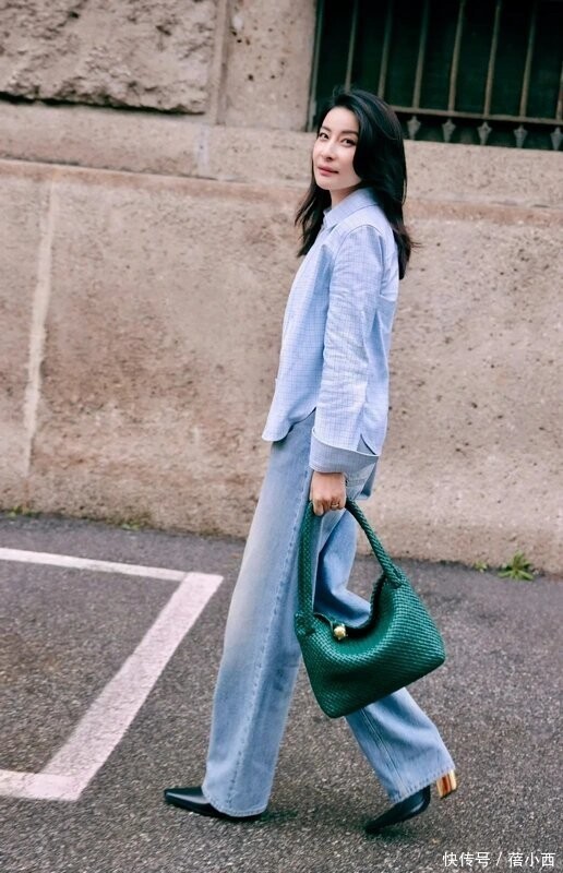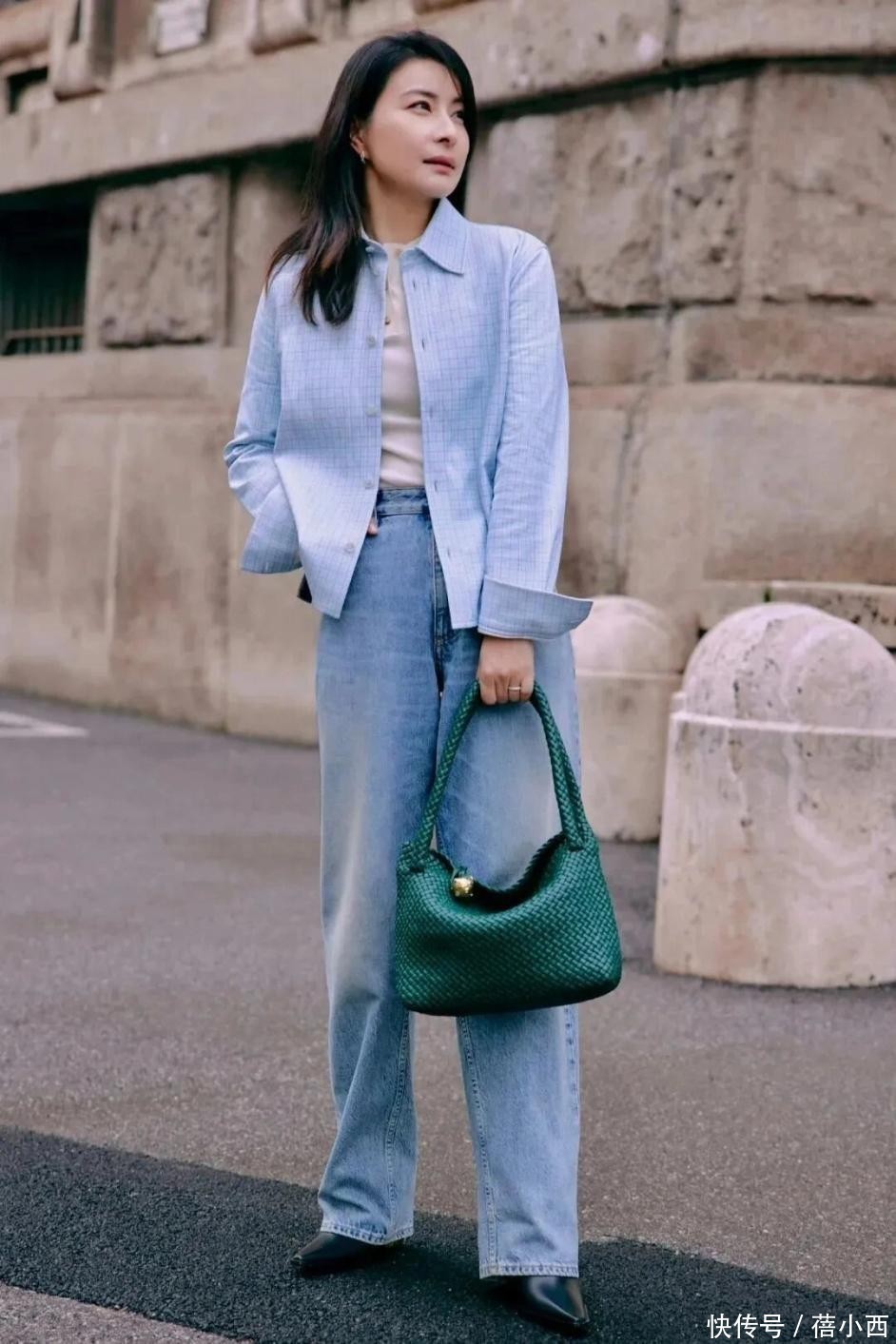 阔腿牛仔裤颜色清爽,不是很深的颜色。从胯部到裤脚都是一样的宽度,因此穿上后不会贴在腿上,对腿型的包容度自然就会很高。手提包的包身融入了菱格设计,层次感增强了。