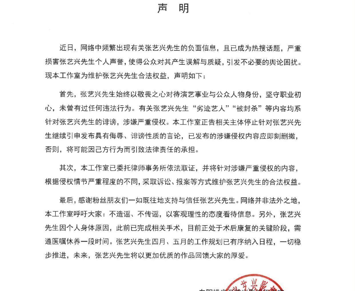 张艺兴那边的工作室出来说话了。他们说那些讲他是劣迹艺人、说他被封杀的话,都是假的。工作室讲得很清楚,张艺兴这个人没干过违法的事。他们已经找了律师,正在收集材料,准备用法律手段来处理这些事。至于为什么最近好像没怎么看到他,工作室也给了个说法。说是今年1月,张艺兴去做了个鼻子方面的手术,叫鼻中隔手术。做完手术总得休息一阵子,身体要紧。所以活动就少了点。不过他们也说了,到了4月和5月,工作安排就会回到正常的轨道上,该干嘛干嘛。不过这份声明里,有些大家议论的事没提。比如有人传他跟国家话剧院有什么关系,还有人说他的项目审批被卡住了。对这些,声明里一个字都没说。