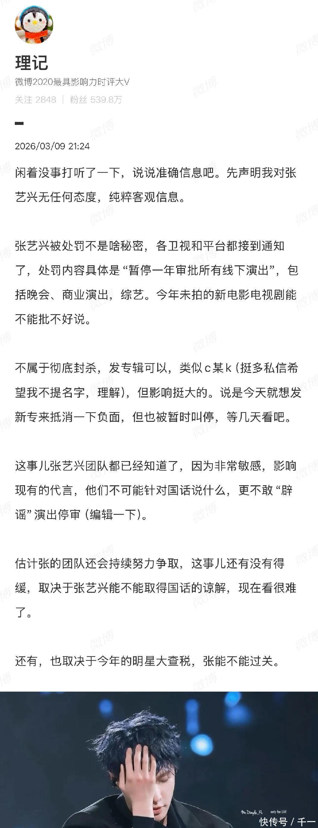 事情发生在2026年3月。他因为一些事,被罚了。处罚内容是,接下来一年里,线下演出不能批。晚会啊,综艺节目啊,商业演出啊,这些都算。新的电影电视剧项目,可能也会有点麻烦。不过专辑还是能照常出的。有个叫理记的人提到另一件事。他说张艺兴在2026年1月的时候,辞职了。辞得挺急的。档案已经调走了,编制也没了。